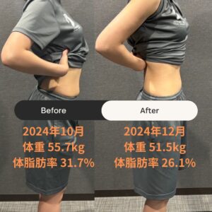 2025/01/24 パーソナルジムに通ってお腹周りスッキリ♪【30代女性】 広島のパーソナルトレーニングジム AdvanStage 代表の上本です。 2か月コース(16回)ご利用のお客様の身体の変化を紹介いたします! 昨年の秋から始め、冬にはすっきりとしたお腹周りを手に入れることができました♪ F様 【期間】 2024年10月~2024年12月(2か月コース) 【結果】 体重 55.7kg→51.5kg(-4.2kg) 体脂肪率 31.7%→26.1%(-5.6%) お腹周りがスッキリされてますね♪ 新規会員様募集中♪ 料金表はこちら パーソナルジムパーソナルトレーニング広島
